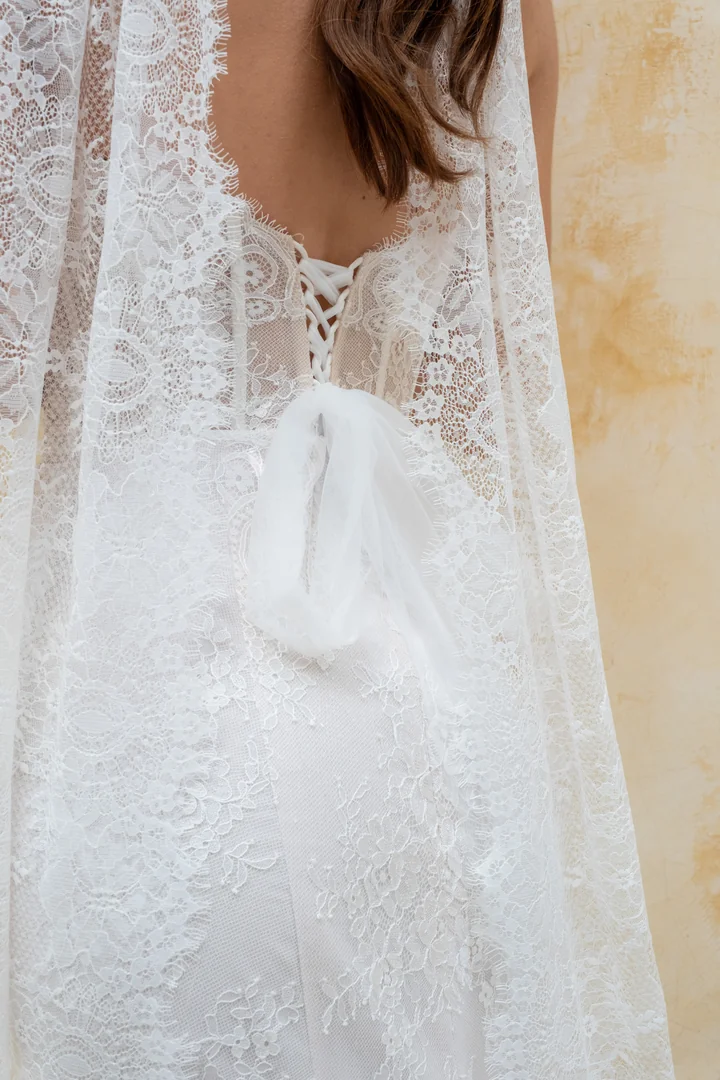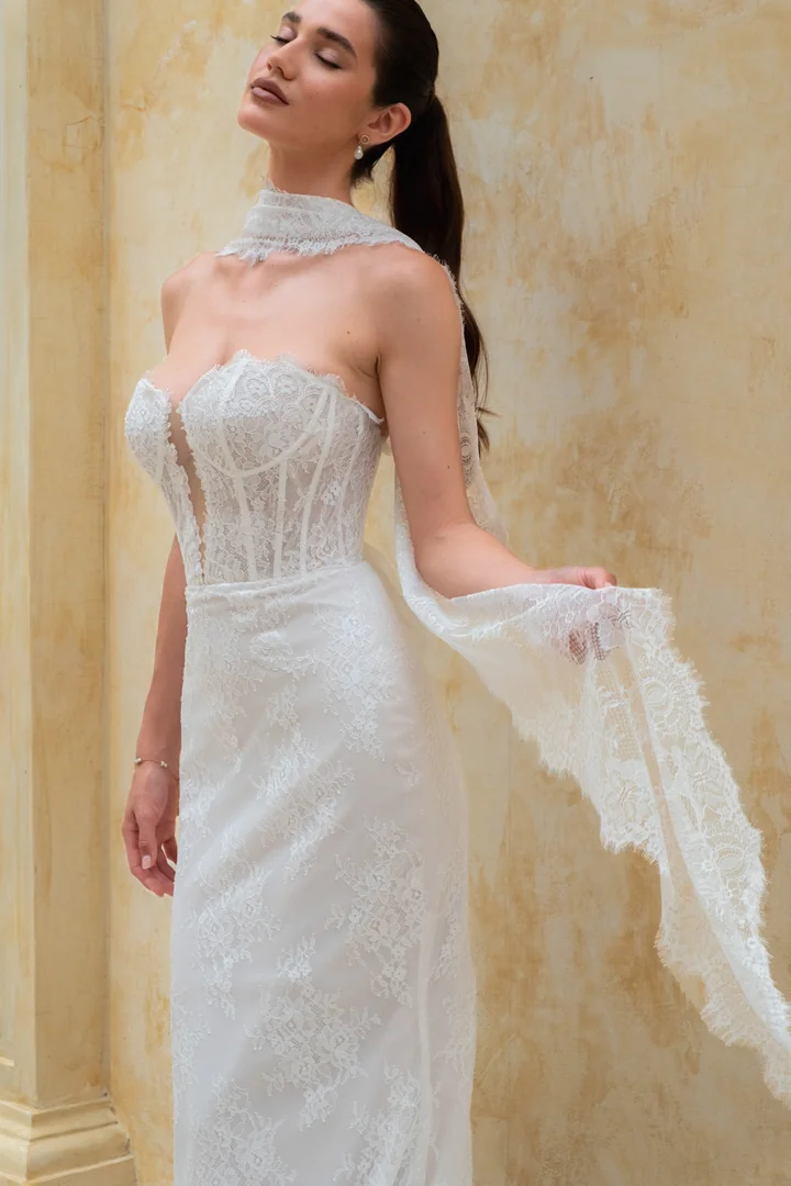 Romantic with a touch of modern allure, Sabine is a fitted Chantilly lace gown designed to beautifully contour the bride’s silhouette. The strapless bodice features a sheer corset construction with a plunging V-neckline, delicately framed with Chantilly eyelash lace and soft floral lace motifs that gently trace the edges, creating a look that feels both refined and feminine. At the back, the bodice is secured with a soft tulle lace-up ribbon, adding a romantic detail while allowing for an adjustable fit. The fit-and-flare lace skirt flows effortlessly into a modest court-length train, offering graceful movement that is perfect for outdoor celebrations or brides who want elegance with ease. Paired with a matching lace scarf, Sabine can be styled to add an extra layer of modern sophistication to this beautifully timeless design.