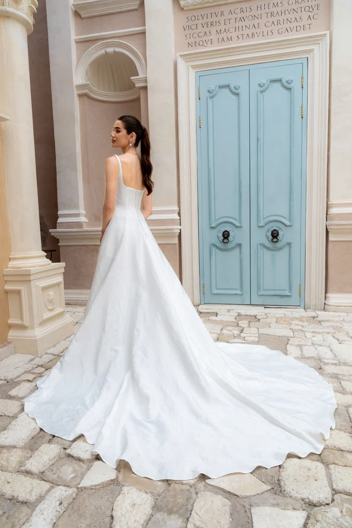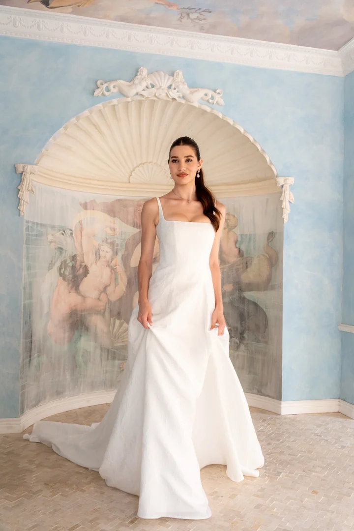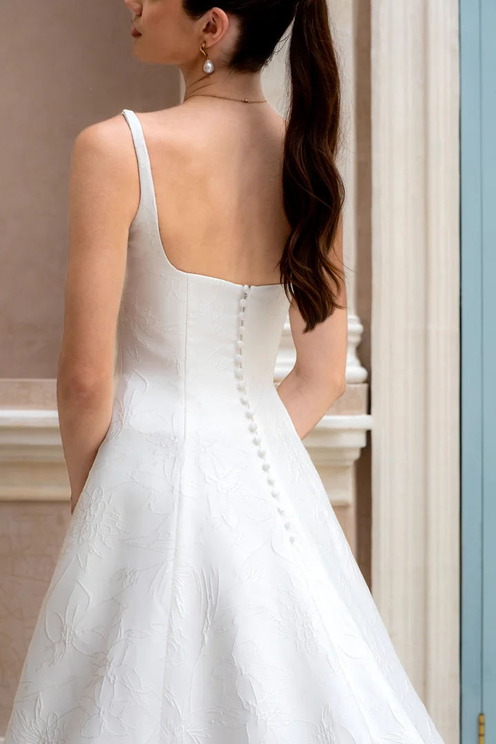 Refined, graceful, and quietly striking, Saffron is a modern princess-style gown designed to celebrate effortless elegance. Inspired by the beloved square neckline of our Michaela gown, this design reimagines the silhouette with clean structure and timeless sophistication. Crafted from luxurious ivory brocade, the fabric reveals subtle woven floral details that add depth and texture while maintaining a beautifully understated finish. The structured square neckline is framed by delicate straps and complemented by a striking open back, creating a balanced look that feels both modern and classic. Sculpted seams contour the bodice before flowing seamlessly into a full skirt, forming a princess-cut silhouette with graceful volume and movement. Elegant yet refreshingly contemporary, Saffron is a gown that captures the beauty of refined bridal style.