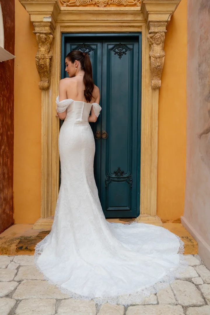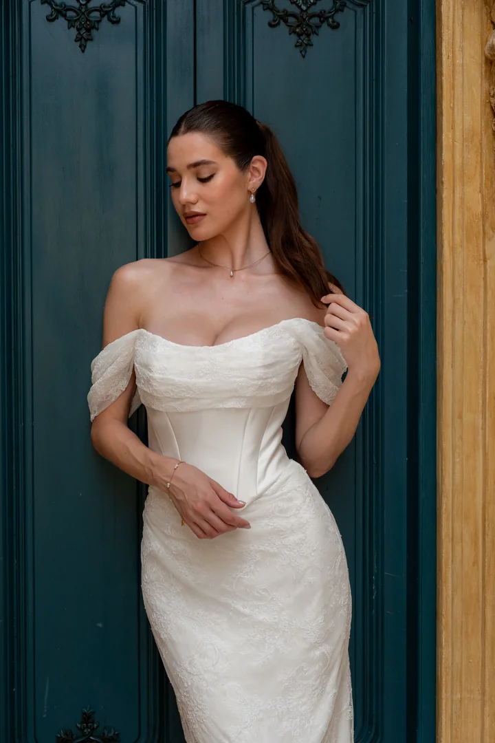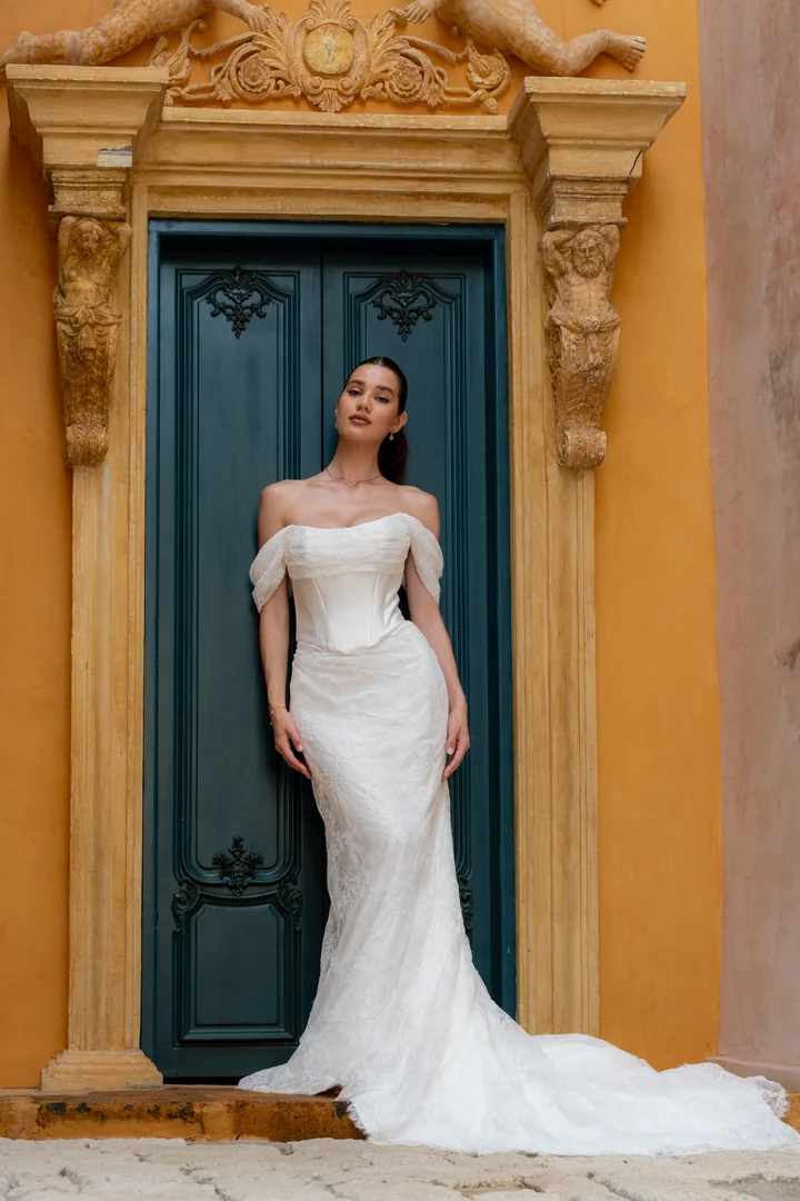 Refined, romantic, and effortlessly versatile, Saskia is a beautifully crafted two-piece gown designed for the bride who loves both structure and softness. The bodice is made from luxurious mikado, sculpted into a flattering strapless corset silhouette that cinches the waist and enhances the figure. Delicate Chantilly lace draping is softly ruched across the bust, extending into detachable off-shoulder strapsthat frame the neckline and gracefully highlight the décolletage and collarbone. At the back, a sleek zipper closure is finished with a row of elegant buttons for a timeless bridal touch. Paired with a fitted Chantilly lace skirt, Saskia creates a silhouette that is both feminine and striking. Gentle ruching at the hip adds texture and dimension before the fit-and-flare design flows into a graceful train. The blend of structured mikado and delicate lace creates a look that feels modern yet romantic, while the detachable straps and the two-piece design offers the freedom to mix-and-match and transform your gown to into multiple bridal looks for your special day.