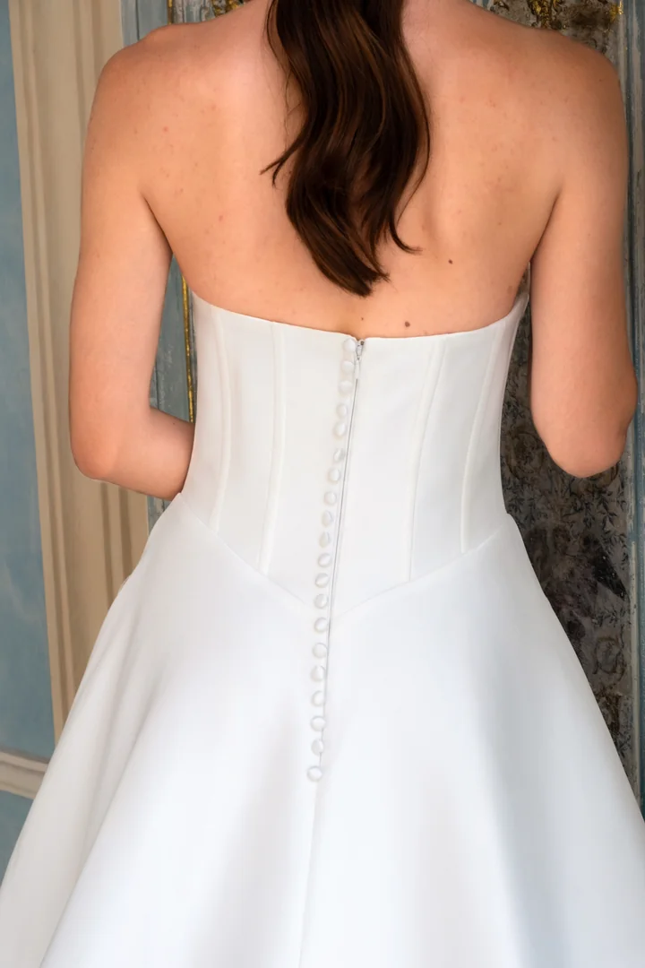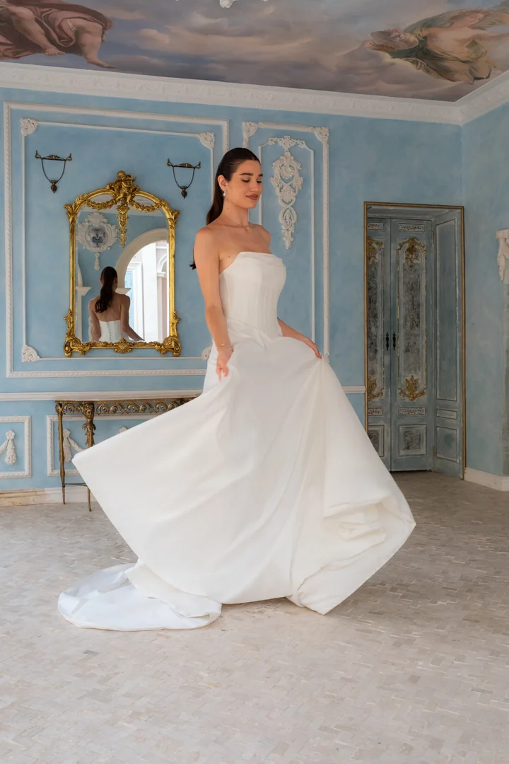 Graceful and refined, Selene is a strapless A-line ballgown that captures the beauty of modern structure and timeless simplicity. Crafted from luxurious soft mikado, the gown features a corset-style bodice with contemporary ruched panels across the bust, complemented by exposed boning that sculpts and supports the silhouette. A flattering basque waistline enhances the natural shape of the waist, creating an elegant, architectural look inspired by the quiet grandeur of European design. At the back, a row of delicate buttons traces the zipper closure, adding a classic bridal detail. The full A- line skirt flows effortlessly from the structured bodice, creating soft volume and movement while discreetly concealing hidden pockets — a modern bride’s must-have. Sophisticated yet effortlessly wearable, Selene is a gown that balances striking structure with graceful simplicity.