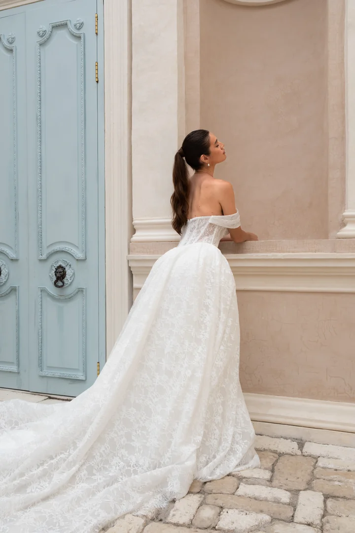 Ethereal yet striking, Seraphine is a romantic lace ball gown designed for the bride who desires softness with structure. The sheer corset bodice features a plunging illusion sweetheart neckline and a beautifully sculpted basque waistline, creating a flattering, elongated silhouette. Delicate lace embroidery adorns the bodice, allowing the intricate floral details to take center stage while highlighting the artistry of the design. Flowing from the waist, the voluminous skirt forms a lightweight ball gown silhouette, crafted from layers of lace that move with effortless grace. The gown feels airy and romantic while maintaining a beautifully structured shape, creating a look that is both modern and timeless. Seraphine also features matching detachable pleated lace off-shoulder straps, allowing the bride to effortlessly transform the look while adding a soft, romantic touch to the neckline.